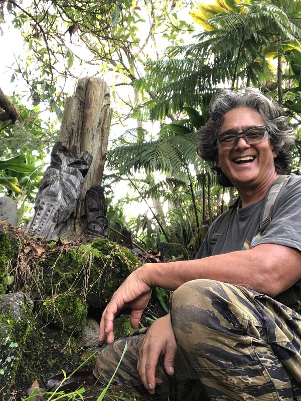Tangarō was always, since childhood, enamored by woven work- baskets, sculptures, textiles, and netting. He never saw himself, however, as a weaver, primarily due to the absence of weavers in his domestic world. "Yes, we had fishnet makers in the family and lauhala weavers in the neighborhood, but I wanted to weave the things I saw at the Bishop Museum and in our Hawaiiana history books, and there was no one I knew that did this. Until that is, Kumulāʻau and Haunani Sing appeared upon my horizon - I know them, they are kind, humble, and patient, and their creations were mind boggling and inspiring. Their vision to have every family with a weaver was also inspiring. So I signed up, and here I am."